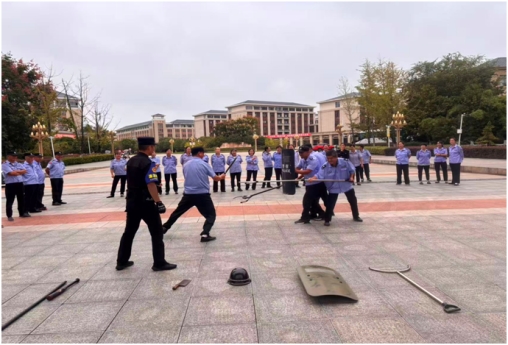 同时,学校还联合濂溪公安分局特巡警大队,组织校内应急救援队伍开展反恐防暴培训及应急演练活动。特巡警大队教官现场演示并指导安防八大件(警用盾牌、钢叉、警棍等)的规范使用方法,重点讲解“最小应急单元”处置过程中的技巧策略,并带领大家开展实战演练。通过培训和演练,进一步强化了安全责任人员的风险预判意识,有效提升了安保队伍应对突发事件的实战处置能力,为实现突发事件“早发现、能防范、可控制”的目标筑牢根基。